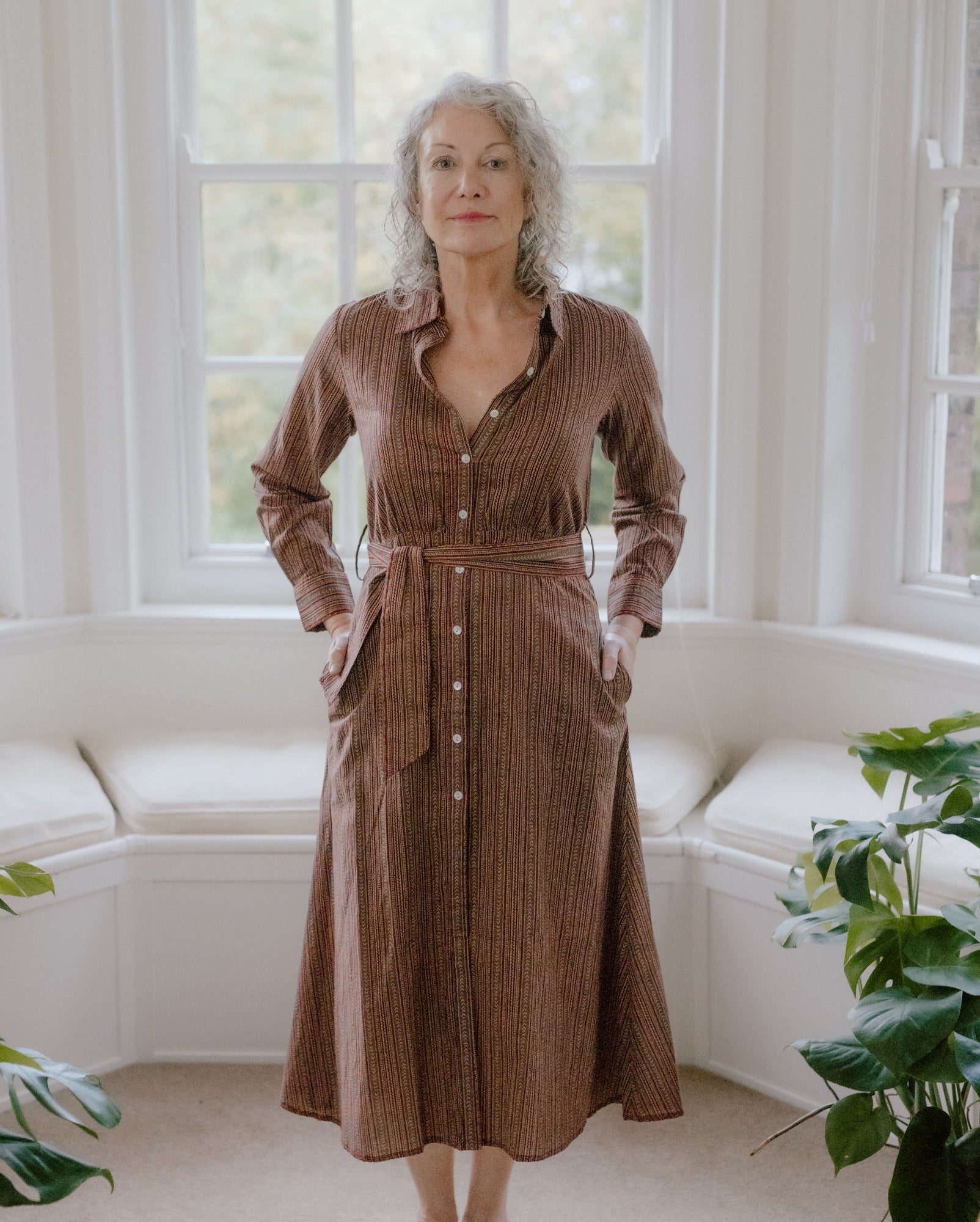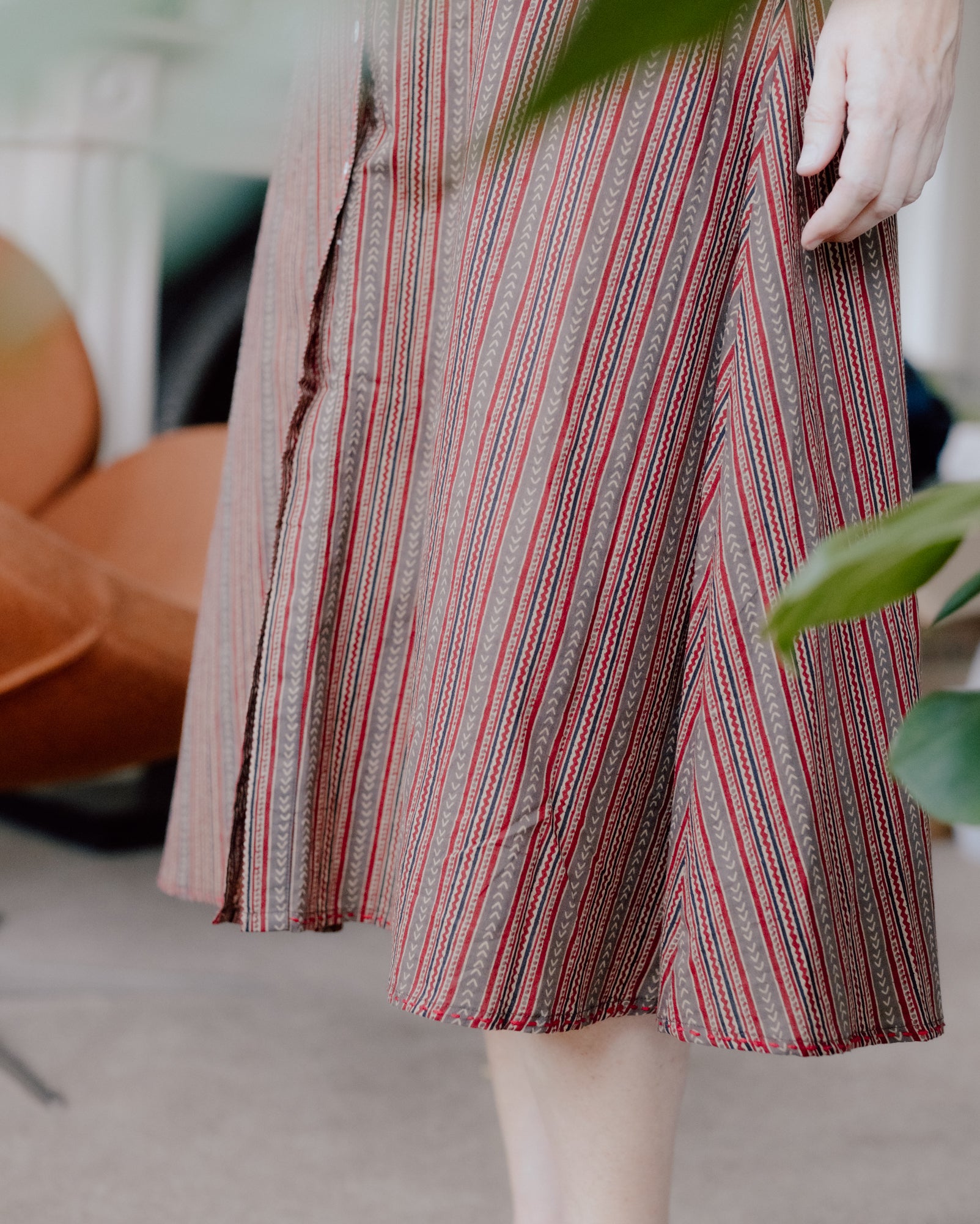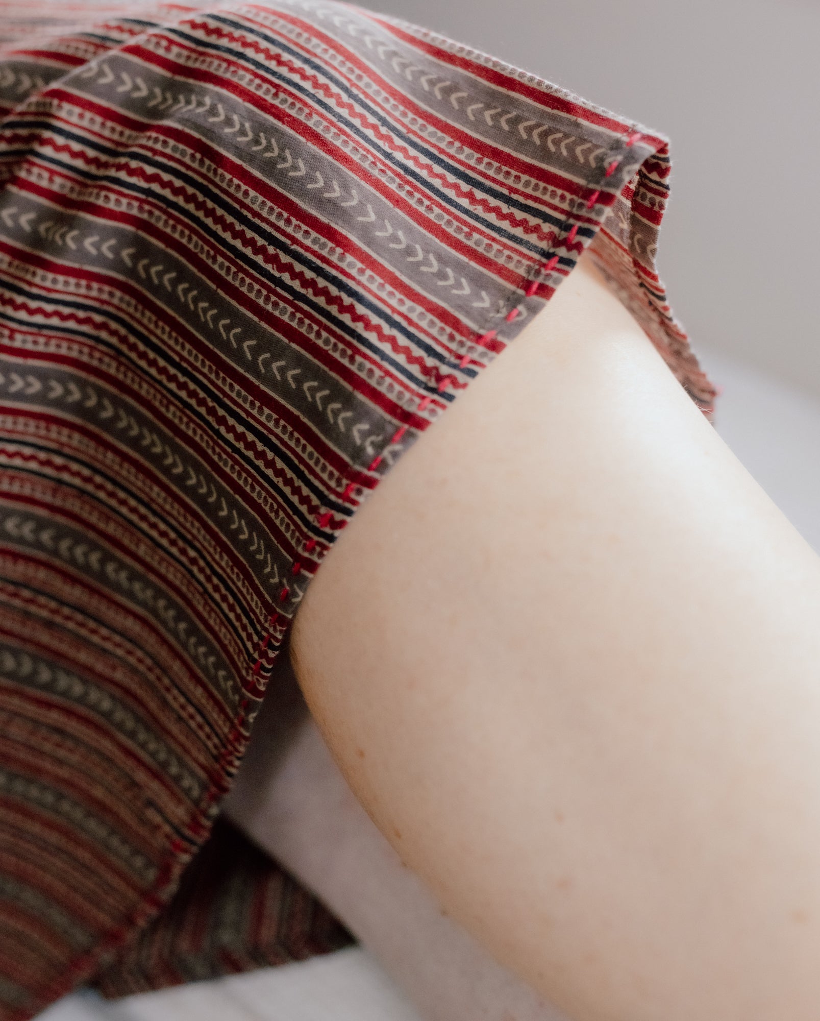 Hand-block-printed, hand-dyed, and hand-sewn by artisans in India, this singular piece embodies centuries of craft translated through a contemporary lens. Created from organic cotton and coloured with azo-free vegetable dyes, every element speaks to a sustainable future - one where fashion uplifts rather than extracts.