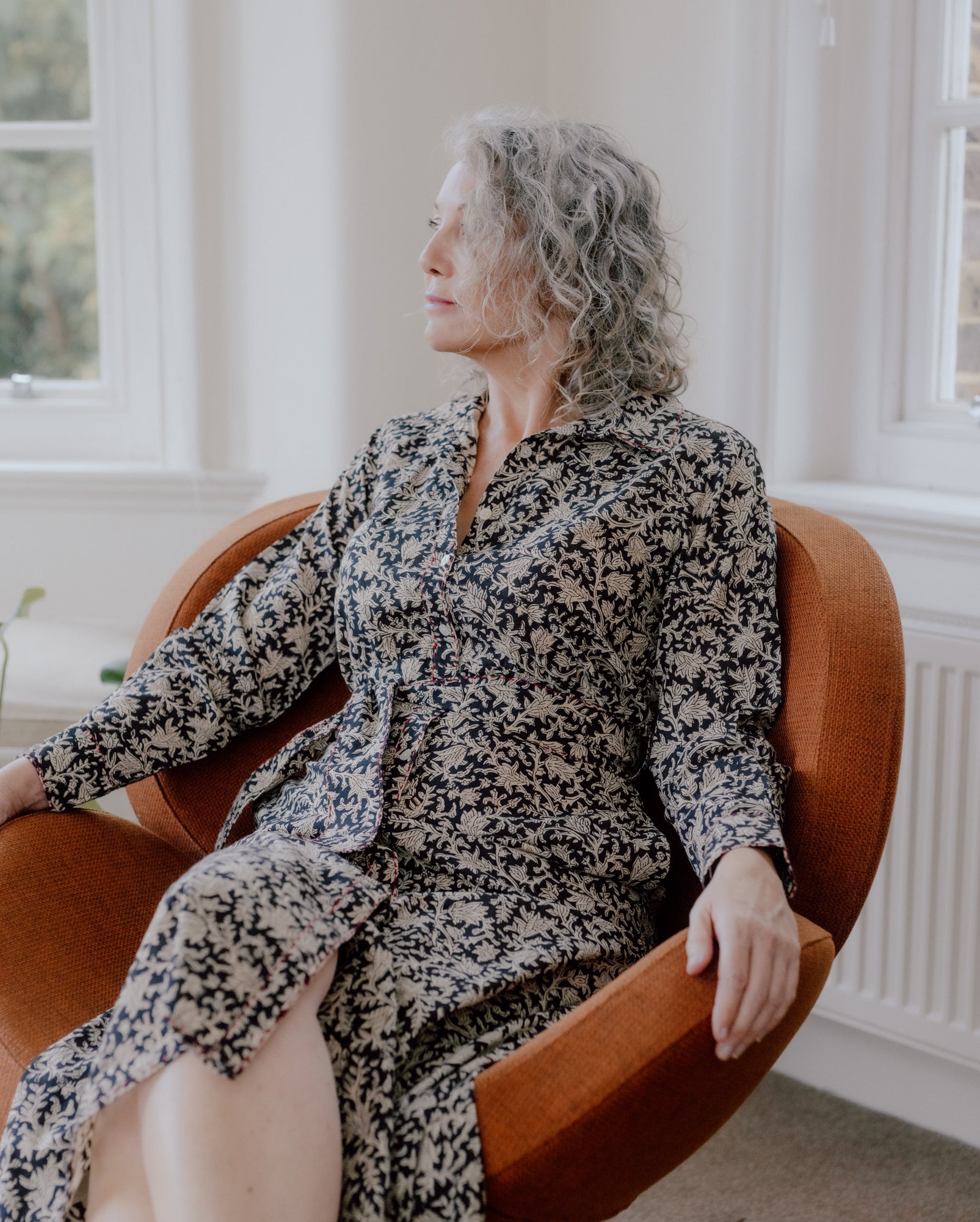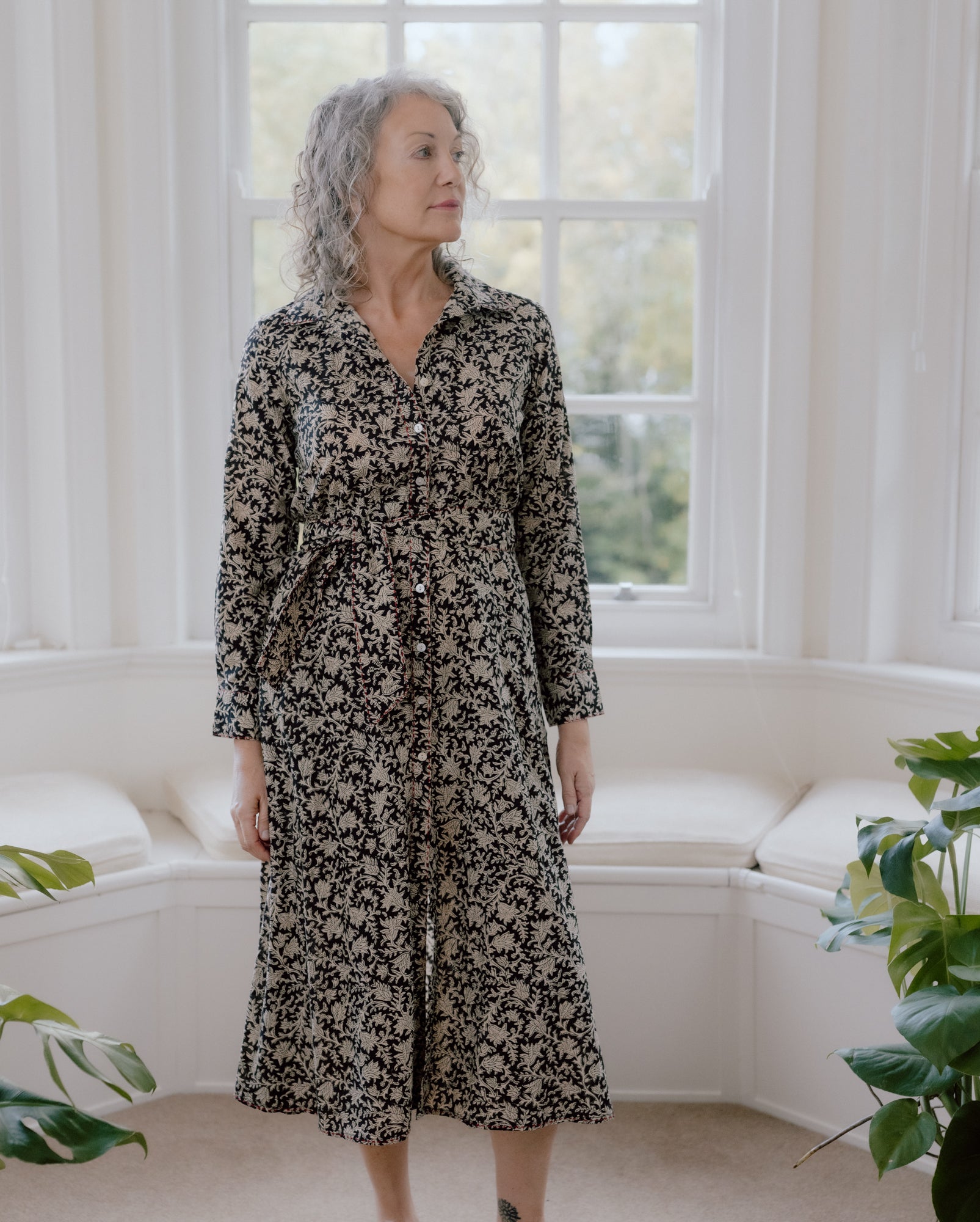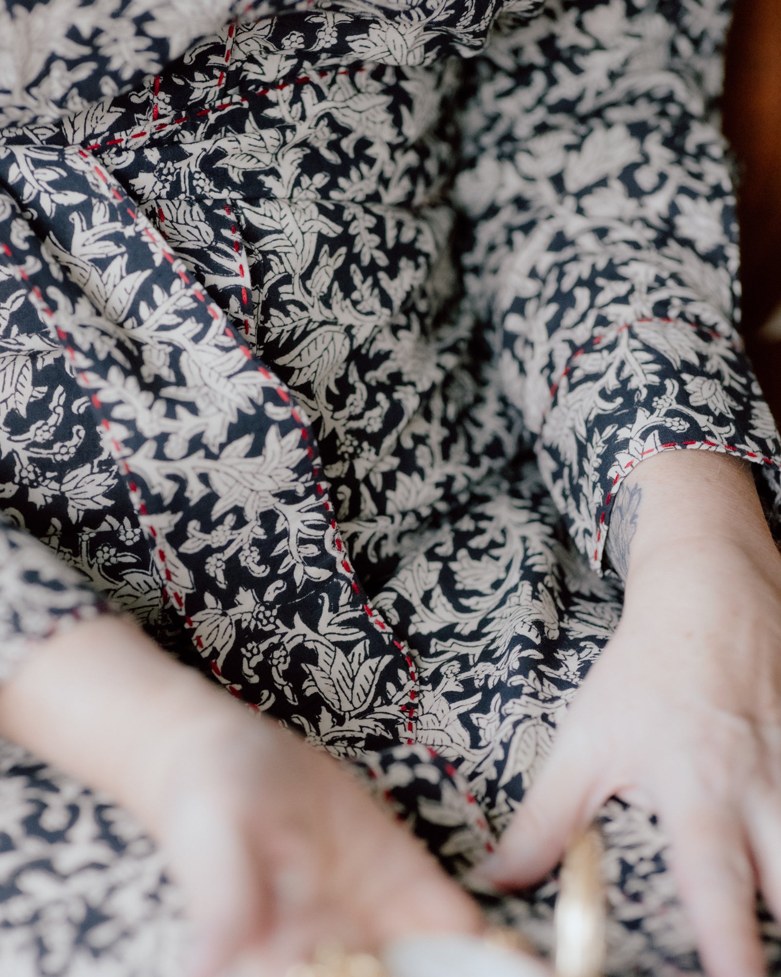 Hand-block-printed, hand-dyed, and hand-sewn by artisans in India, this singular piece embodies centuries of craft translated through a contemporary lens. Created from organic cotton and coloured with azo-free vegetable dyes, every element speaks to a sustainable future - one where fashion uplifts rather than extracts.